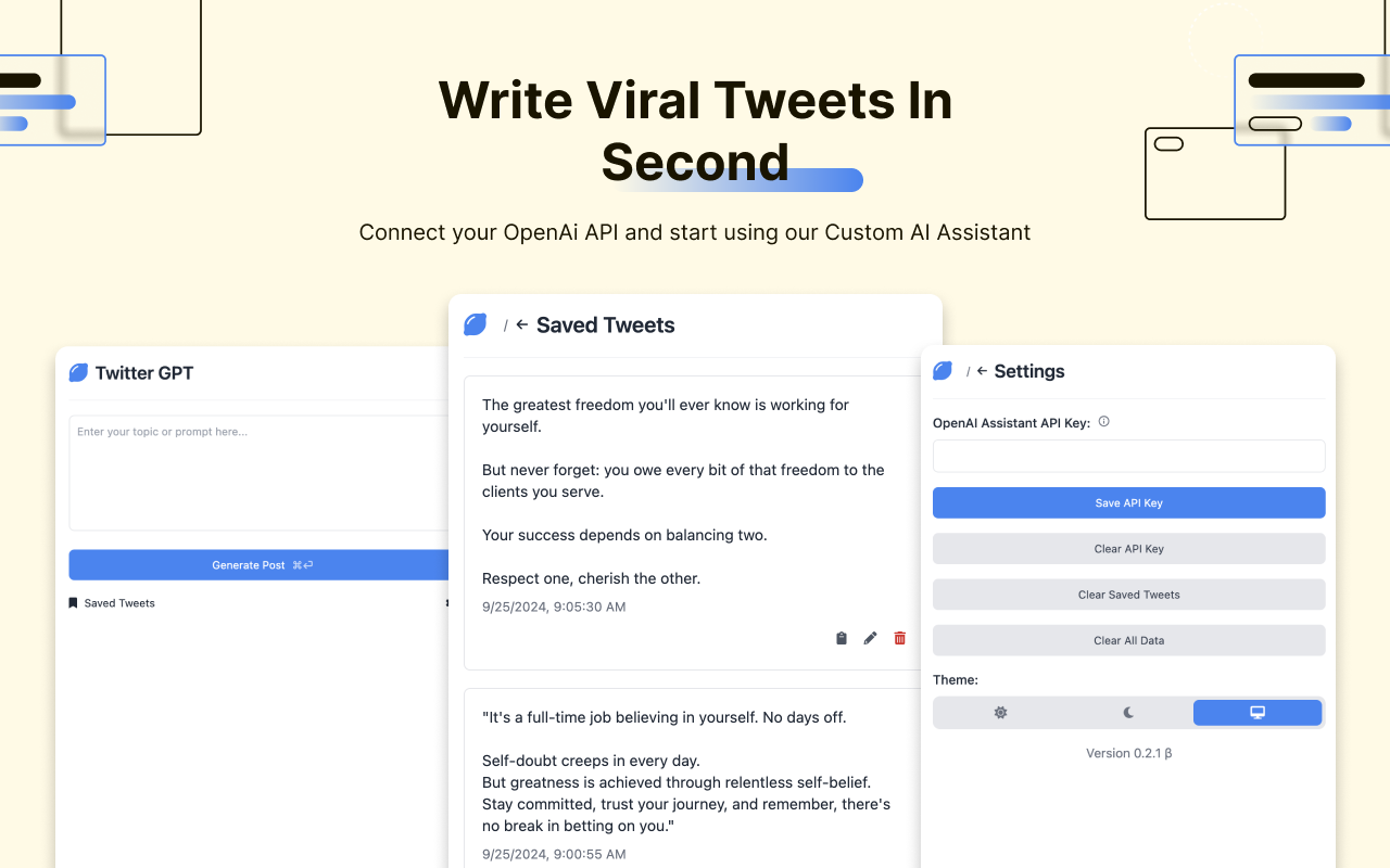 - Storage: This permission is required to store your preferences, API keys, and generated tweets locally, so your settings and content are accessible even when you're offline.5. Remote CodeOur extension does not use or execute any remote code. All functionality is contained within the extension package for maximum security and transparency.6. User ControlYou retain full control over your data. You can clear all stored data (including preferences and generated tweets) at any time by resetting the extension settings within your browser. Additionally, you can revoke any permissions granted to the extension via the Chrome settings.7. Data SecurityWe implement appropriate measures to protect your information, including ensuring that all data remains local to your device and is never transmitted to our servers or third-party entities.8. Changes to This Privacy PolicyWe may update this Privacy Policy from time to time. Any changes will be reflected in the "Last updated" date at the top of this page. We encourage you to review this Privacy Policy periodically to stay informed about how we are protecting your information.9. Contact UsIf you have any questions or concerns about this Privacy Policy or the handling of your data, please contact us at:Email: [email protected]By using the AI-Powered Tweet Generator Chrome Extension, you agree to the terms outlined in this Privacy Policy.